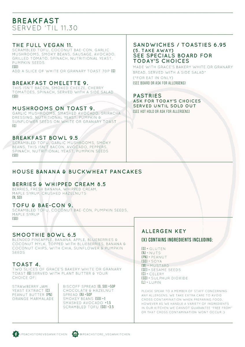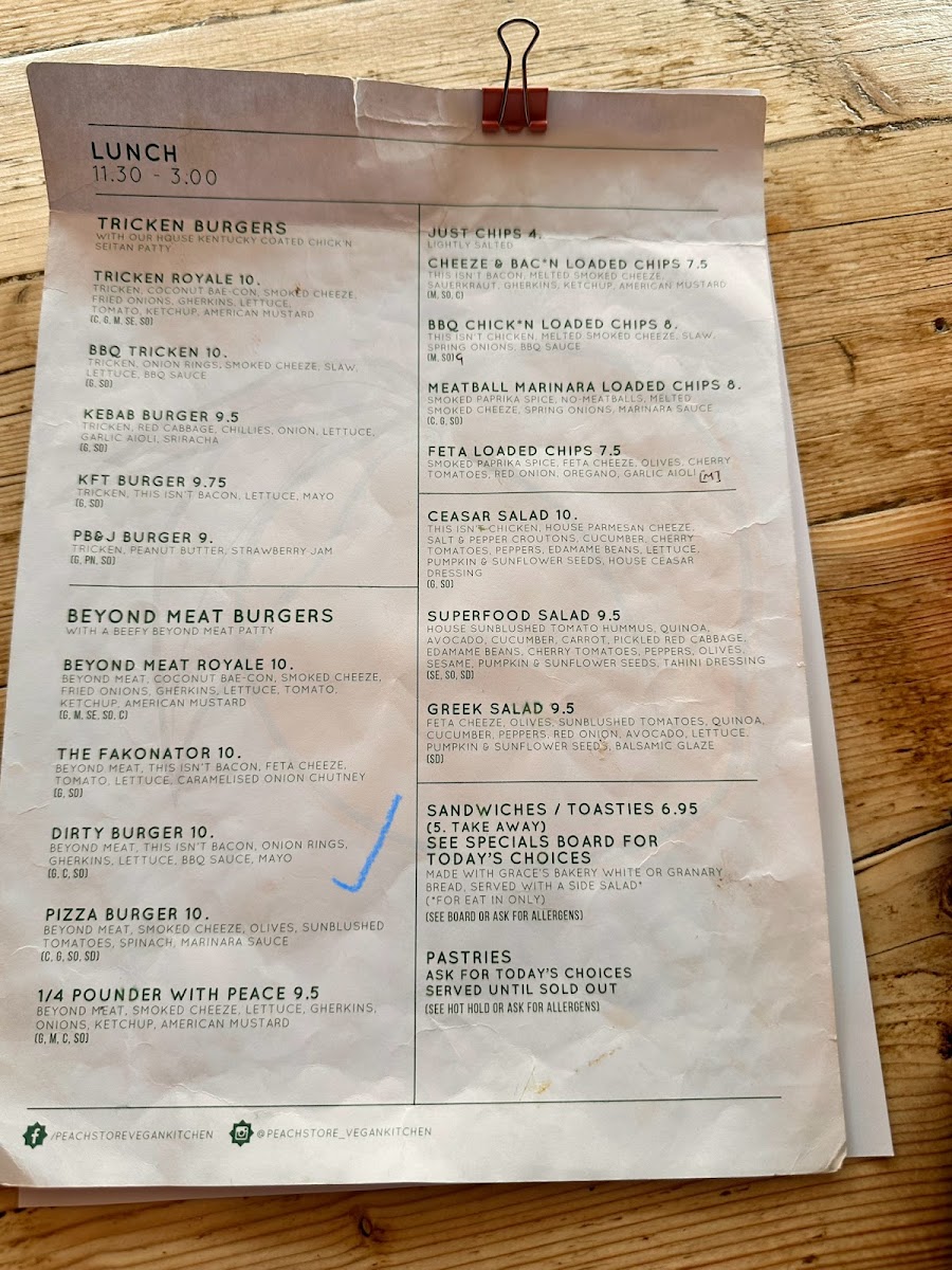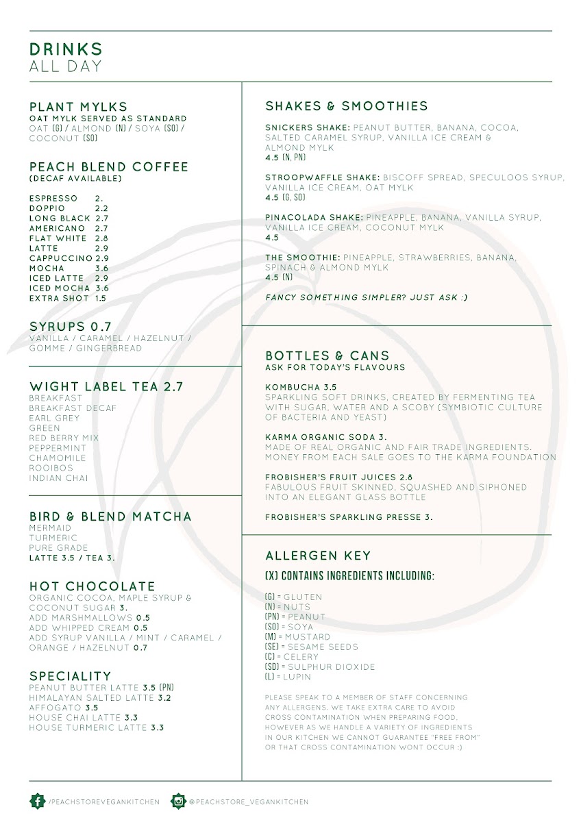 The menu at Peach Vegan Kitchen & Zero Waste Store reflects a thoughtful balance between comfort food and nutrient-focused vegan cooking, with enough variety to keep every visit interesting. Drinks set a strong tone, from the rich Peanut Butter Latte and earthy Matcha Latte to the gently spiced Chai Latte, Oat Latte, and indulgent Hot Chocolate, while sweeter options like the Chocolate Milk, Summer Smoothie, and the bold Chai Shake with Espresso Shot add playful energy to the lineup. On the food side, the kitchen excels at reworking familiar favourites into satisfying plant-based versions: the BBQ Tricken Burger, Dirty Burger, and Royal Burger are filling, flavour-forward choices that clearly anchor the menu, while sides such as Chunky Chips and Thick Cut Chips with a Sprinkling of Fine Salt deliver simple, well-executed comfort. Lighter and more nourishing dishes are equally well represented, with the Superfood Salad, Smoothie Bowl, and Sesame Tofu Salad with Hummus offering freshness, texture, and balance. Breakfast-style and grab-and-go items like Scrambled Eggs, Sausage Sandwich, and the Cauliflower Chickpea and Onion Bhaji Pasty highlight the café’s versatility throughout the day. Even the drinks list beyond coffee stays on brand, with Karma Ginger Beer adding a crisp, refreshing contrast. Overall, the menu feels cohesive and intentional, combining indulgence and health-conscious choices in a way that makes the vegan concept feel inclusive, satisfying, and genuinely enjoyable rather than restrictive.